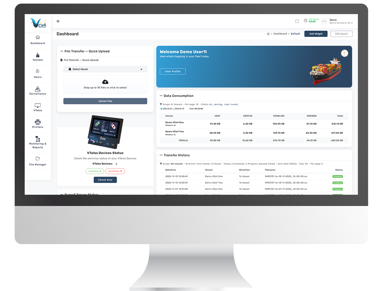 VCell Cyber provides a smooth, secure, fully controlled, consolidated, centralized and multi-functional onboard ICT environment, for digital infrastructure and ship-to-shore communications, managed and administered remotely on a 24-hour basis.